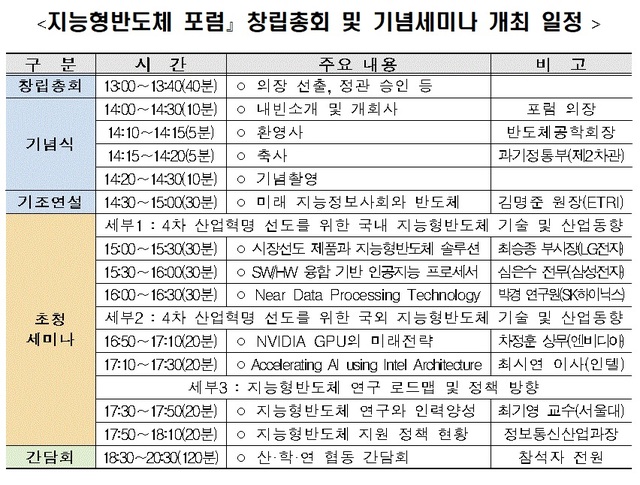 과학기술정보통신부는 이날 오후 1시 노보텔앰베서더 강남호텔에서 산학연 관계자 100여명이 참석한 가운데 '지능형반도체 포럼' 창립총회와 기념식·세미나를 개최했다.