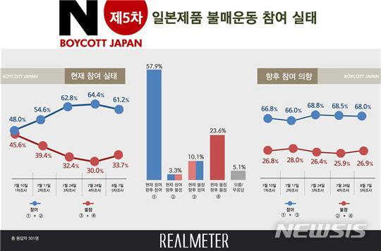 여론조사 전문기관 리얼미터는 tbs 의뢰로 전날 전국 19세 이상 성인 남녀 501명을 대상으로 실시한 '일본제품 불매운동 5차 실태조사' 결과를 8일 발표했다.