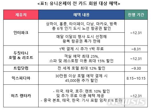 유니온페이 인터내셔날은 최근 유니온페이 회원에게 제공되는 해외여행 혜택을 업그레이드했다. 오는 31일까지는 한국인의 인기 여행지로 꼽히는 괌, 태국, 중국, 필리핀 등에 위치한 두짓타니 호텔 앤 리조트의 객실 1박 예약시 추가 1박을 무료로 제공하는 프로모션을 진행한다. 10월15일까지는 익스피디아를 통해 호텔을 예약하는 회원 대상으로도 할인 프로모션을 진행한다. 익스피디아에서 유니온페이 카드로 해외 호텔 예약시 30만원 이상 결제하면 4만5000원의 할인을 받을 수 있다.