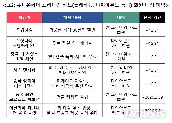 프리미엄 카드(플래티늄, 다이아몬드 카드) 회원들에게는 더욱 특별한 혜택을 제공한다. 올해 12월31일까지 여행 예약 사이트인 트립닷컴에서 항공권 200달러 이상 결제 시 최대 30달러 할인 혜택을 받을 수 있다. 프리미엄 카드 회원들은 더 라운지 멤버스 앱 인증과 유니온페이 프리미엄 카드를 제시하면 국내외 공항 라운지를 무료로 상시 이용할 수 있으며 인천공항 내 캡슐 호텔과 사우나도 무료로 이용할 수 있다.