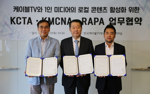한국케이블TV방송협회(KCTA)와 한국엠씨엔협회(KMCNA), 한국전파진흥협회(RAPA)는 22일 서울 충정로 KCTA 대회의실에서 로컬 콘텐츠 제작 활성화를 위한 3자 MOU를 체결했다.