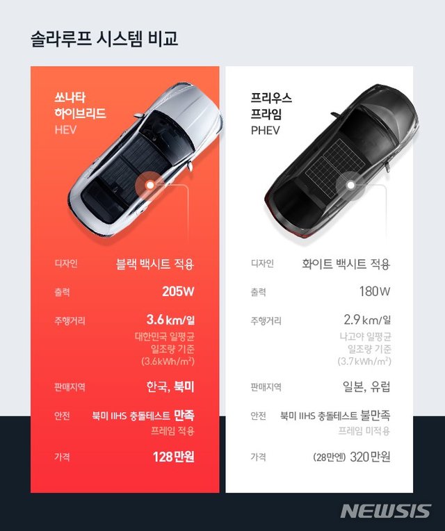 솔라루프의 가격도 쏘나타는 128만원인 데 비해 프리우스는 28만엔(한화 약 320만원)에 이른다. 쏘나타의 시스템이 두 배 이상 경제적인 셈이다.