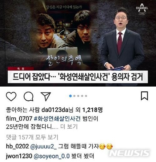 봉준호 감독은 팔로워가 게시한 연쇄살인범의 검거 소식을 19일 자신의 SNS에 게재했다. 사진 속에는 특정된 용의자의 체포소식을 알린 채널A의 단독화면이 캡처돼 있다. 채널A의 뉴스속보 화면에는 봉 감독이 연출한 '살인의 추억' 포스터 속 송강호와 김상경의 모습이 보인다.