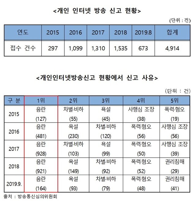 국회 과학기술정보방송통신위원회 소속 이원욱 더불어민주당 의원이 우정사업본부로부터 제출받은 '개인 인터넷방송 신고 현황' 자료를 분석한 결과 2015년부터 2019년 8월까지 5년간 신고 건수가 4914건으로 집계됐다.