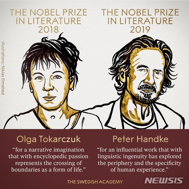 스웨덴 한림원은 10일(현지시간) 토카르추크와 한트케를 각각 2018년과 2019년도 노벨문학상 수상자로 선정했다고 발표했다.