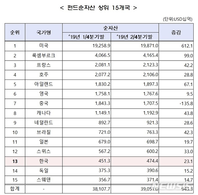 한국의 펀드순자산은 전분기 4513억 달러 대비 5.1%, 231억 달러 증가한 4744억 달러 기록하며 13위를 유지한 것으로 조사됐다.