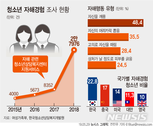 이미원 청소년상담센터장은 "타인의 자해 시도 목격 경로 중 50.6%가 SNS, 메신저, 인터넷 등에 집중돼 자해의 확산성, 파급력, 모방성, 실행 빈도 등의 심각도가 증가하고 있다"며 "건강한 SNS 활용교육과 함께 스트레스 대처 기술 교육 및 해소 경험 제공이 필요하다"고 밝혔다.