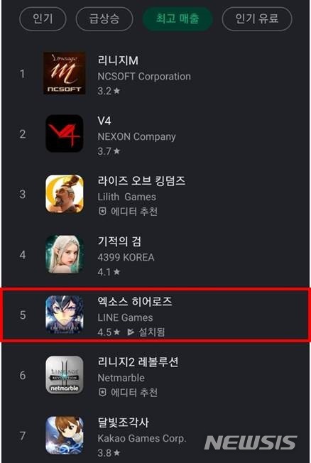 [서울=뉴시스]오동현 기자 = 라인게임즈 주식회사는 모바일 RPG '엑소스 히어로즈'가 국내 구글플레이 기준 최고 매출 5위에 올랐다고 25일 밝혔다.