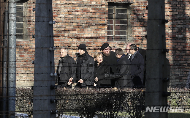[오시비엥침(폴란드)=AP/뉴시스] 김재영 기자 = 독일의 앙겔라 메르켈 총리가 6일 아돌프 히틀러 나치 정권의 악명 높은 아우슈비츠 강제수용소 시설에 처음으로 발을 들여놓았다.