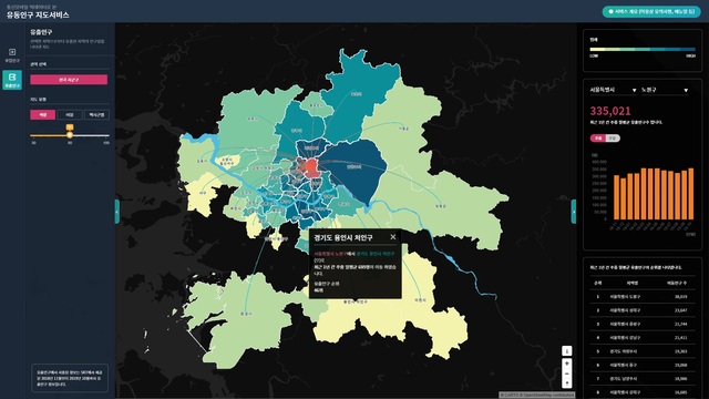 이번에 공개한 유동인구 지도는 전국 시·군·구별 유동인구를 파악하기 위해 마련됐다. SK텔레콤의 이동통신 기지국의 모바일 빅데이터를 기반으로 지도상에 선택한 지역의 인구 유입·유출 현황을 시각적으로 확인할 수 있다.
