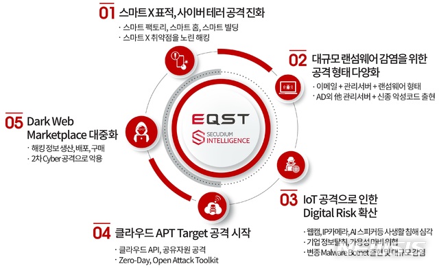 EQST그룹이 전망한 내년도 주요 사이버 위협은 ▲스마트 산업시설을 노리는 사이버 공격 ▲다양한 방식을 결합한 대규모 랜섬웨어 공격 ▲IoT 기기 공격으로 인한 기업 리스크 확산 ▲클라우드 대상 APT 표적 공격 ▲다크웹 해킹 정보를 활용한 2차 공격 등 총 다섯 가지다.