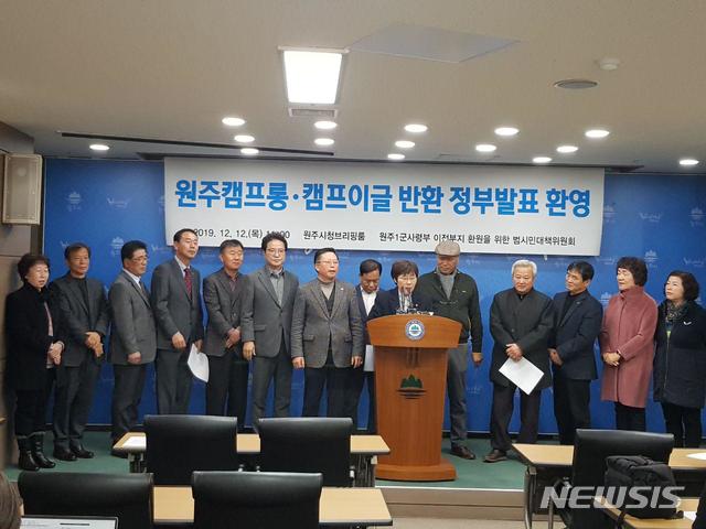 [원주=뉴시스] 권순명 기자 = 강원 원주시 캠프롱 기지 반환 범시민대책위원회가 12일 오전 원주시청에서 캠프롱과 캠프이글 반환결정을 미국과 합의한 정부발표를 적극 환영했다.