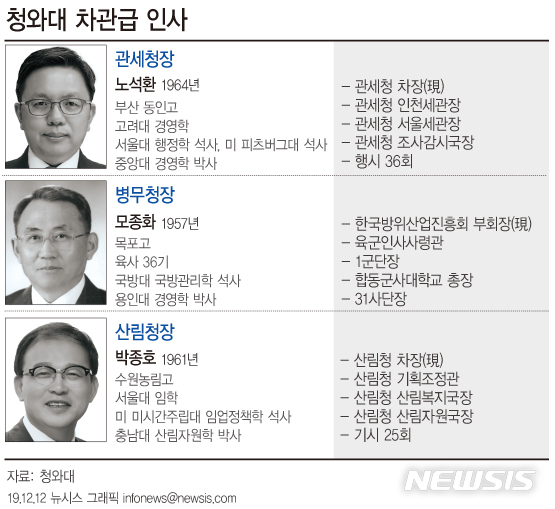 관세청장 노석환·병무청장 모종화·산림청장 박종호