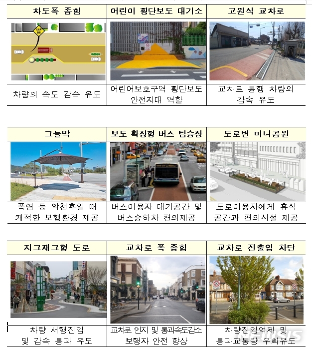이번에 제정한 설계지침은 도시 내 도로에서도 ‘안전속도5030’을 반영하고 도로변 미니공원과 어린이 횡단보도 대기소 등 보행자 안전과 편의를 높인 것이 특징이다. 이를 통해 사람중심 도로환경을 만드는 것을 목표로 한다.
