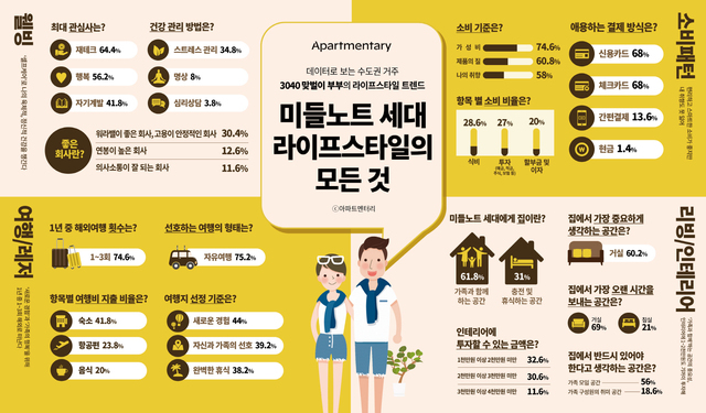 6일 인테리어 기업 아파트멘터리가 서울·경기 지역 아파트에 사는 30~40대 맞벌이 부부 500명을 대상으로 라이프스타일 관련 설문조사를 한 결과, 이들의 최대 관심사 세 가지는 재테크(64.4%), 행복(56.2%), 자기계발(41.8%)이었다. 또 이들 세대가 생각하는 좋은 회사의 조건은 일과 삶의 균형이 잘 맞는 회사와 고용이 안정적인 회사가 각각 30.4%로 가장 높았고, 연봉이 높은 회사는 12.6%에 불과했다. 해당 세대는 여행에도 관심이 많았다. 74.6%가 1년에 1~3회 해외 여행을 간다고 답했다. 여행을 가는 이유로는 새로운 경험을 하기 위해서가 29.9%, 가족의 행복을 위해서가 26.3%였다.