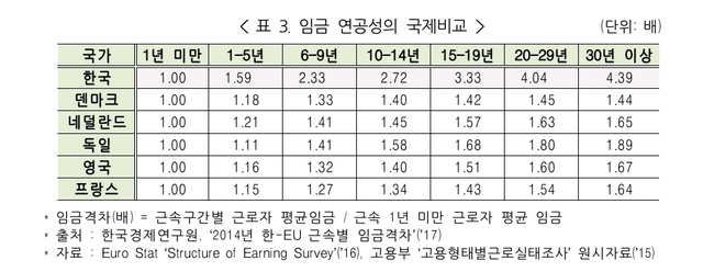 보고서는 또한 EU 주요국과의 임금 연공성 비교를 통해 우리나라의 임금연공성이 가장 높은 수준이며 특히 대기업일수록 연공성이 가중되고 있다고 봤다.