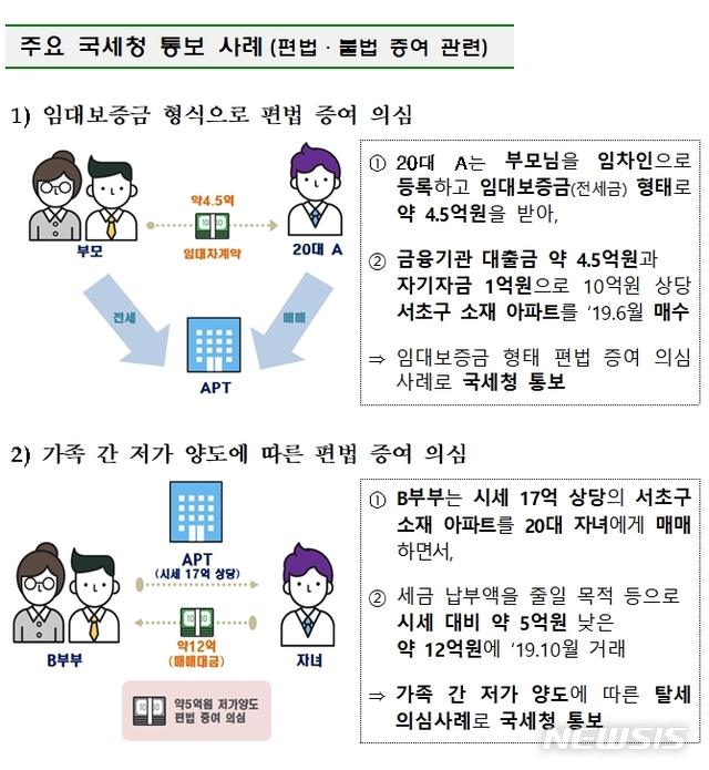 B씨 부부는 시세 17억 상당의 서초구 소재 아파트를 20대 자녀에게 매매하면서 시세 대비 약 5억원 낮은 약 12억원에 거래했다. 정부는 이번 사례에 대해 가족 간 저가 양보에 따른 편법 증여로 의심하고 국세청에 통보했다.