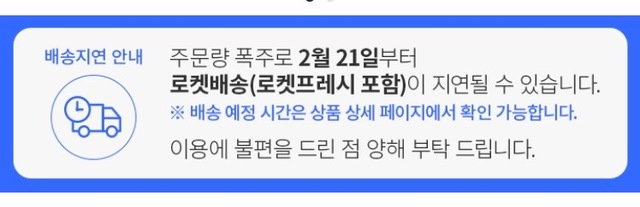 쿠팡은 20일 홈페이지에 배송 지연 안내 공지를 띄웠다. "주문량 폭주로 21일부터 롯켓배송(로켓프레시 포함)이 지연될 수 있다"는 내용이다. 로켓배송은 주문 다음 날 배송해주는 서비스다. 최근 감염 경로를 알 수 없는 확진 환자가 나오고, 대구 지역 코로나19 확산으로 지역사회 전파 가능성이 제기되자 마트에 가기보다는 온라인을 이용해 장을 보는 수요가 급증한 것으로 풀이된다. 코로나19 사태가 벌어지기 전 로켓배송 일일 평균 배송량은 약 180만건이었다. 코로나19가 확산한 뒤 배송량은 330만건까지 치솟았다. 지난 2일에도 배송 지연 사태가 벌어졌다.