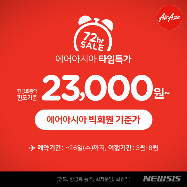 [서울=뉴시스] 고은결 기자 = 에어아시아가 4시간 이상의 중장거리 노선을 이용하는 탑승객 100만명을 대상으로 24일 오전 1시부터 27일 오전 1시까지 72시간 한정 프로모션을 진행한다.