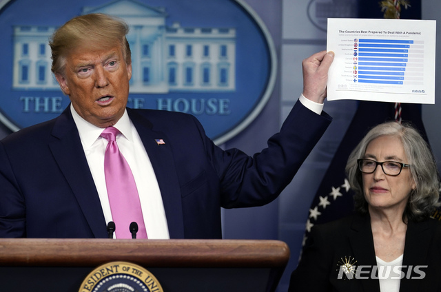 [서울=뉴시스] 신정원 기자 = 도널드 트럼프 미국 대통령은 26일(현지시간) 미국 내 신종 코로나바이러스 감염증(코로나19) 위험이 "매우 낮다"고 평가했다.