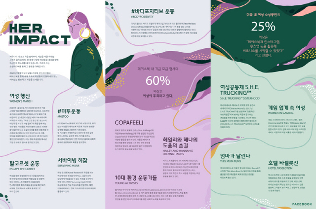 이번 인포그래픽은 인스타그램과 페이스북, 왓츠앱 등 페이스북 패밀리앱을 통해 전 세계에 자신들의 목소리를 냄으로써 자신이 속한 커뮤니티는 물론 사회 전반에 고무적인 변화를 불러일으키고 있는 대표적인 여성들의 다양한 행보와 이야기를 담고 있다.