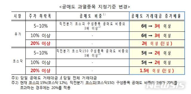 또 주가가 20% 이상 하락한 종목은 공매도 거래대금 증가배율을 코스피 2배, 코스닥 1.5배로 하는 지정기준도 신설한다. 과열종목으로 지정된 주식의 공매도 금지기간은 현행 1거래일에서 10거래일(2주)로 연장된다.