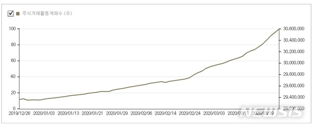 주식거래 활동 계좌수는 코로나19가 국내에 확산되기 시작한 지난달 17일부터 급증하더니 3월들어 국내 증시가 폭락세를 보이자 큰 폭의 증가세를 보인 것으로 나타났다.