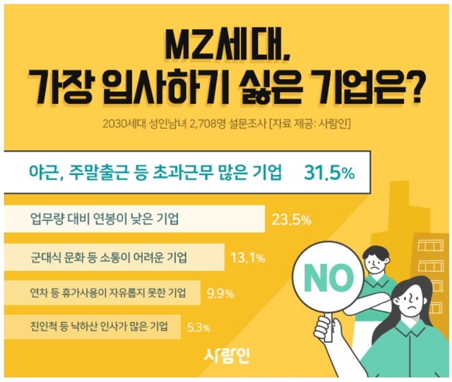 구인구직 매칭플랫폼 사람인(대표 김용환)이 20~39세 남녀 2,708명을 대상으로 ‘가장 입사하기 싫은 기업 유형’을 조사한 결과, 야근, 주말출근 등 초과근무 많은 기업(31.5%)이 1위에 올랐다. 이는 ‘워라밸’과 개인의 삶, 여가를 중시하는 MZ세대의 특성이 반영된 것으로 풀이된다.