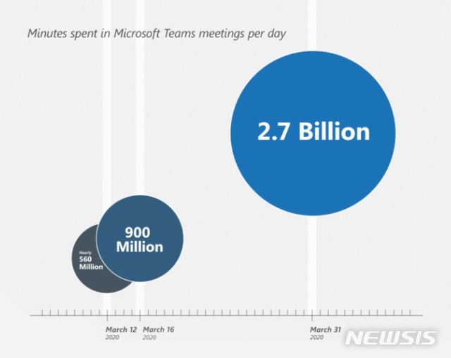 보고서에 따르면 팀즈를 활용한 화상 커뮤니케이션(video calls in Teams)은 3월에만 1000% 이상 증가했다. 지난달 31일 하루에만 팀즈 비디오 콘퍼런스 사용 시간은 최대치인 27억분으로, 3월16일 9억분에 비하면 보름 만에 3배 늘었다.