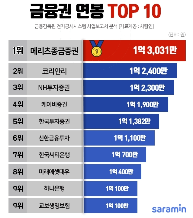 직원 1인당 급여는 ▲메리츠종금증권이 1억 3,031만원으로 가장 높았다. 다음으로 ▲코리안리(1억 2,400만원) ▲NH투자증권(1억 2,300만원) ▲케이비증권(1억 1,900만원) ▲한국투자증권(1억 1,382만원) ▲신한금융투자(1억 1,100만원) ▲한국씨티은행(1억 700만원) ▲미래에셋대우(1억 400만원) ▲하나은행(1억 100만원) ▲교보생명보험(1억 100만원) 등이 상위 10위권에 들었다.