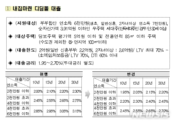신혼부부디딤돌 대출의 경우 평균 0.2%p를 인하해 금리가 현행 1.70~2.75%에서 1.65~2.40%로 낮아진다. 신혼부부디딤돌 대출은 부부합산 연소득 7000만원 이하인 신혼부부(혼인 후 7년 이내인 부부)가 신청할 수 있다.