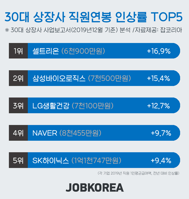 이어 ▲셀트리온(12.5%) ▲NAVER(9.5%) ▲LG생활건강(9.0%) ▲SK하이닉스(7.8%)와 삼성SDS(7.8%) 순으로 남성직원 연봉이 많이 오른 것으로 나타났다.