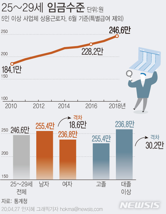 평균 임금은 남성이 여성보다 높았다. 2018년 기준 20~24세의 경우 남자는 208만5000원을 벌었고 여자는 194만4000원을 벌어 14만1000원 차이가 났다. 남녀 간 격차는 지난 2015년(3만9000원) 이후 계속 커지고 있다.