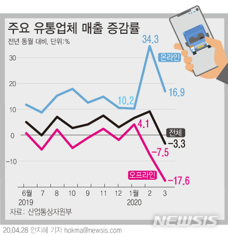 28일 산업통상자원부가 발표한 '2020년 3월 주요 유통업체 매출 동향'을 보면 지난달 주요 유통업체 매출액은 10조8900억원으로 전년 대비 3.3% 감소했다.