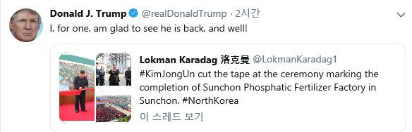 [서울=뉴시스] 오애리 기자 = 도널드 트럼프 미국 대통령이 사망설까지 돌았던 김정은 북한 국무위원장의 복귀에 환영 트윗을 날렸다.