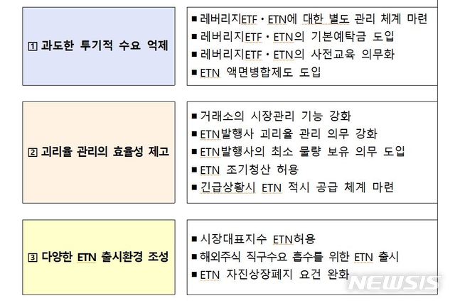 김정각 금융위 자본시장정책관은 "미국에서도 레버리지 ETF·ETN 시장 과열이 사회문제로 떠올랐고 현지 운용사들이 나스닥 등 거래소에 서한을 보내 레버리지와 인버스 ETF 시장을 차별적으로 관리해 달라는 건의를 했다"며 "투자자가 느끼는 위험도나 상품분류를 다르게 해 거래소나 당국이 좀 더 차별적으로 예의주시할 수 있도록 별도 시장분류나 관리체계를 구축할 필요성이 있다는 것"이라고 설명했다.