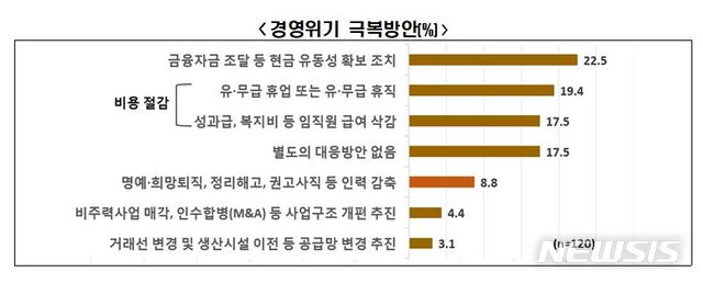 17일 한국경제연구원이 여론조사기관 리서치앤리서치에 의뢰해 국내 매출액 500대 기업 대상으로 '코로나19 사태에 따른 기업 구조조정 현황'을 조사한 결과에 따르면, 코로나19에 따른 경영위기 극복방안은 ▲금융자금 조달 등 유동성 확보(22.5%) ▲휴업·휴직(19.4%) ▲급여 삭감(17.5%) ▲명예·희망퇴직, 정리해고, 권고사직 등 인력 감축(8.8%) ▲비주력사업 매각, 인수합병(M&A) 등 사업구조 개편(4.4%) 순으로 나타났다.