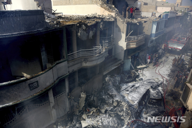 [카라치=AP/뉴시스] 문예성 기자 = 파키스탄에서 98명을 태운 A320 여객기가 22일 오후 파키스탄 남부 카라치의 공항 인근 주택가에 추락했다.
