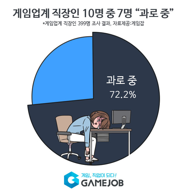 No.1 게임 취업포털, 게임잡(대표 윤병준)이 게임업계 직장인 399명을 대상으로 '과로 현황' 조사한 결과, 게임업계 직장인 중 72.2%는 현재 자신이 ‘과로 중’이라 답했다.