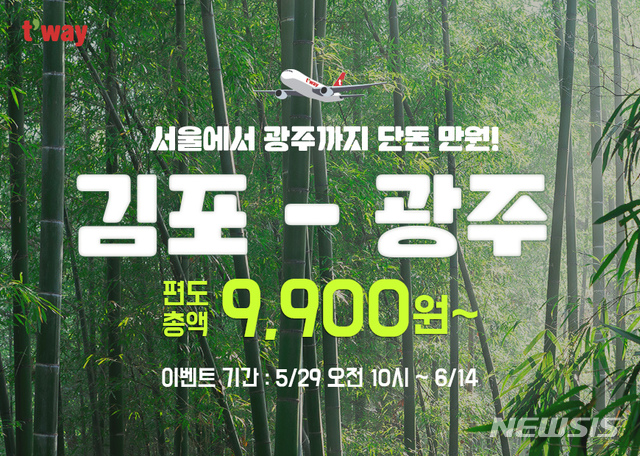 [서울=뉴시스] 고은결 기자 = 티웨이항공은 6월26일부터 7월23일까지 매일 2회 김포~광주 노선 부정기편을 운항한다고 28일 밝혔다. 운항편수는 144편이며 총 2만7216석을 공급할 예정이다.