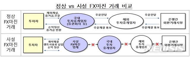 금감원은 "사설 FX마진 거래 업체들은 금융상품으로 오인하게 해 소비자들이 투자에 나서고 있으나 대법원은 법상 금융투자상품이 아니라고 판단하는 등 일종의 도박에 해당할 수 있다"며 "제도권 금융사를 이용하지 않으면 민원이나 분쟁조정 대상이 아니기 때문에 구제를 받을 수 없어 인가 금융사인지 반드시 확인해야 한다"고 조언했다.