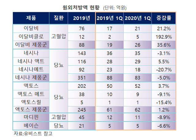 출시한지 오래돼 이미 무한경쟁 체제에 노출된 이들 약은 '이달비'를 제외하면 국내에서 하락세에 있거나 유지하는 수준이다. 이달비는 올해 1분기(1~3월) 전년 동기보다 35.6% 증가했지만, 출시 3년째 아직 블록버스터에 도달하지 못했다. 지난해 국내에서 88억원의 원외처방액(유비스트 기준)을 기록했다. 5개 브랜드의 국내 합산 매출은 750억원이다.