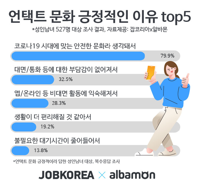 잡코리아(대표 윤병준)가 알바몬과 함께 성인남녀 527명을 대상으로 조사한 결과, 성인남녀 중 73.1%가 언택트 문화를 긍정적으로 보고 있었다. ‘언택트 문화가 긍정적’이란 답변은 20대(74.6%)와 30대(69.9%), 40대 이상(73.2%) 전연령에서 모두 높게 집계됐다. 이들 성인남녀들이 언택트 문화를 긍정적으로 생각하는 이유는 ‘코로나19시대에 맞는 안전한 문화라 생각돼서’, ‘대면/통화 등에 대한 부담감이 없어져서(32.5%)’, ‘앱/온라인을 통한 비대면 활동에 익숙해져서(28.3%)’등이었다(*복수응답).