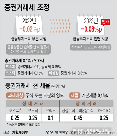 금융투자소득 전면 시행과 상장주식 양도소득 과세대상이 확대되는 2023년에는 증권거래세를 0.08%p 추가로 낮출 계획이다. 2023년까지 총 0.1%p를 인하하는 셈이다. 이에 따라 2023년에는 코스피(농특세 포함)와 코스닥은 0.15% 세율이 적용된다. 비상장 증권거래세 세율은 0.45%에서 0.35%로 내려가게 된다.