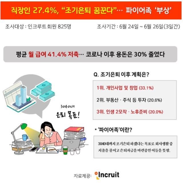 특히 코로나 이후 용돈도 30% 줄인 것으로 확인됐다. 취업포털 인크루트(대표 서미영)가 ‘파이어족’을 주제로 직장인 대상 설문조사 진행 결과다.