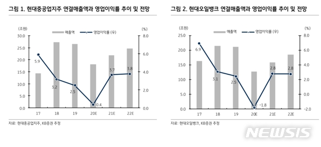 그는 "현대오일뱅크의 실적이 제2공장 정기보수(4/8~5/22)와 시황회복지연으로 매출이 크게 감소한 가운데 영업이익이 250억원 수준에 그칠 전망이고, 현대글로벌서비스의 벙커링 매출도 국제유가 하락의 영향이 있었을 것으로 예상된다"고 분석했다.