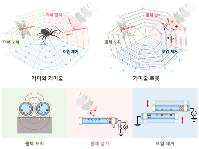 16일 한국연구재단에 따르면 서울대학교 선정윤·김호영 교수 연구팀 (제1저자: 이영훈, 송원준 연구원)은 거미의 행동학적 특성에 착안해 전기적으로 주변의 물체를 감지하여 포획하고 불필요한 오염물을 스스로 털어내는 거미줄 로봇을 개발했다.