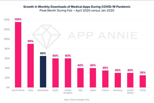 모바일 데이터 및 분석 플랫폼인 앱애니(App Annie)는 코로나19 팬더믹 기간 동안 의료앱 다운로드 증가율을 조사해 발표했다.