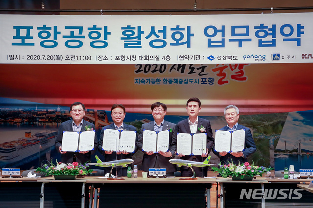 진에어는 20일 오전 포항시청 대회의실에서 최정호 진에어 대표, 이철우 경북도지사, 이강덕 포항시장, 주낙영 경주시장, 손창완 한국공항공사장 등 주요 관계자들이 참석한 가운데 포항공항 활성화를 위한 업무 협약을 체결했다.