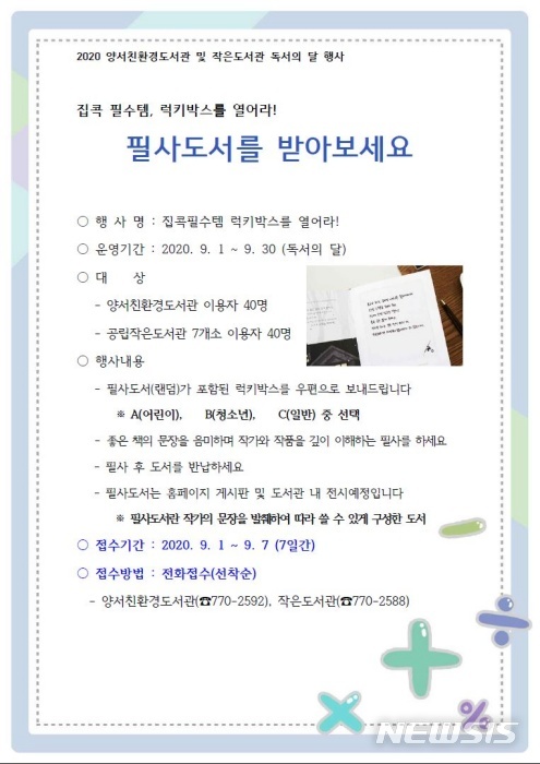 [양평=뉴시스] 문영일 기자 = 경기 양평군은 양서친환경도서관과 작은도서관 7개소 이용자들을 대상으로 2020 독서의 달 행사 ‘집콕 필수템, 럭키박스를 열어라’를 진행한다고 1일 밝혔다.